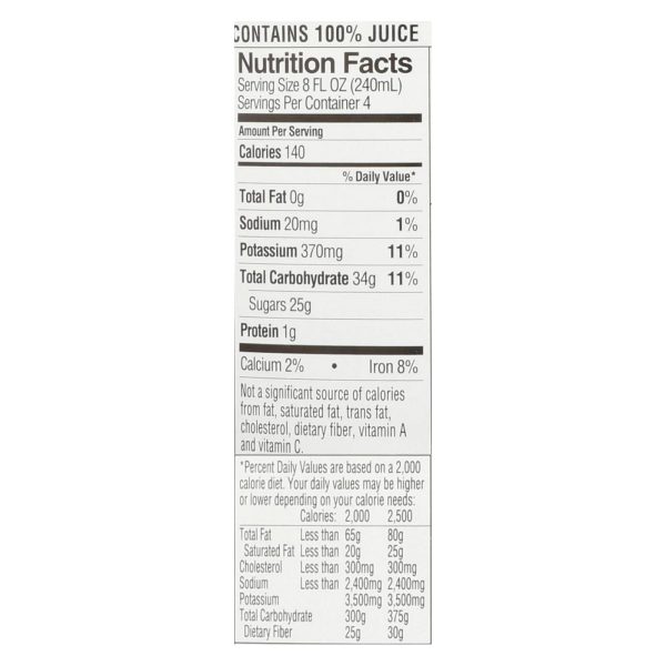 Rw knudsen’s organic just tart cherry juice is made from 100% tart cherry concentrate. It’s all-natural, so there are no preservatives or artificial colors. Every 32 fl. Oz. Bottle is unsweetened, certified organic, non-gmo and pastuerized for your safety. Each cup of juice is equivalent to one serving of fruit. See nutrition facts panel for allergens.