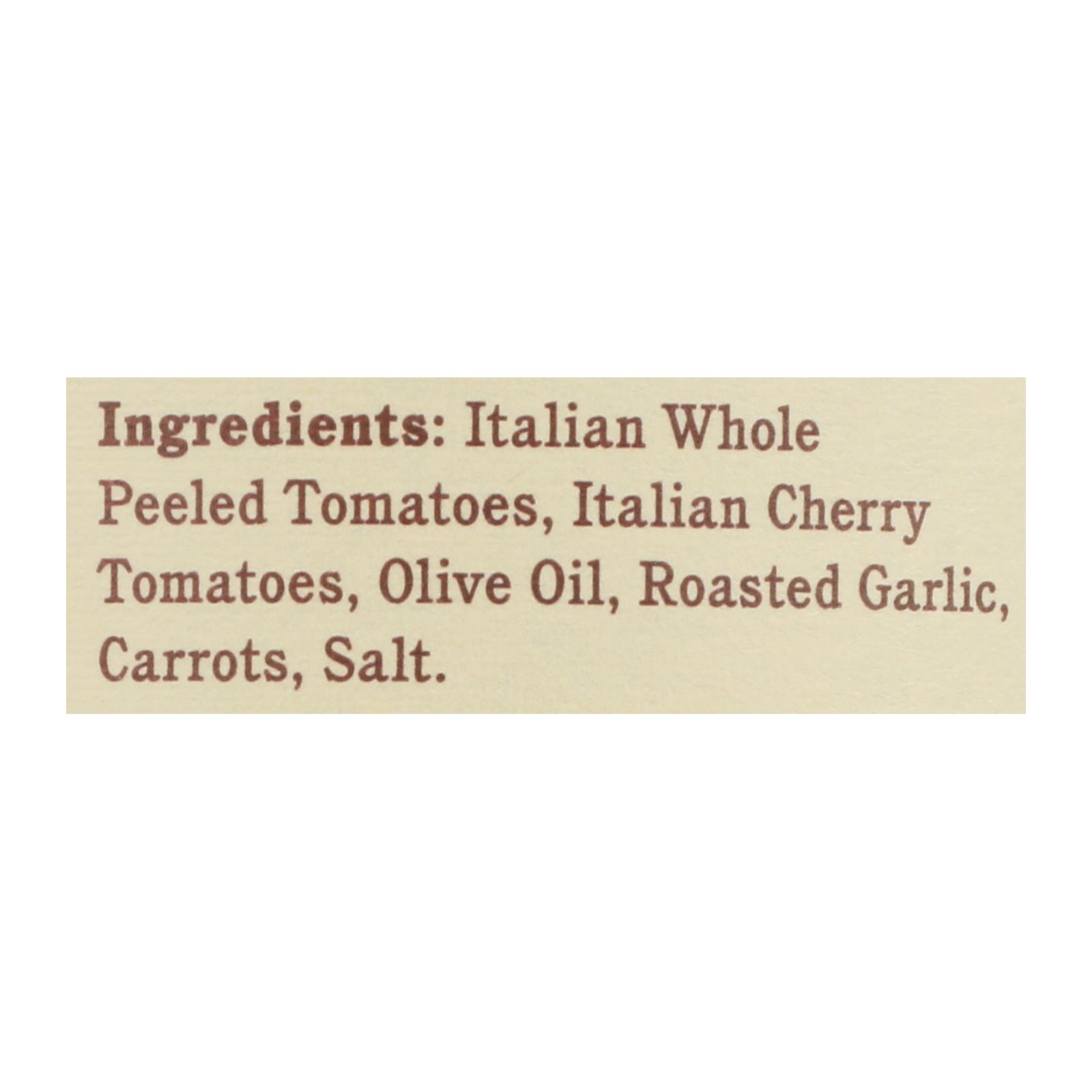 ingredients : italian whole peeled tomatoes;italian cherry tomatoes;olive oil;roasted garlic;carrots;salt