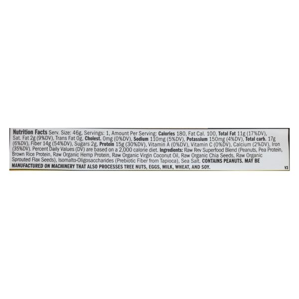 ingredients : raw rev superfood blend;peanuts;pea protein;brown rice protein;raw organic hemp protein;raw organic virgin coconut oil;raw organic chia seeds;raw organic sprouted flax seeds;isomalto-oligosaccharides;prebiotic fiber from tapioca;sea salt