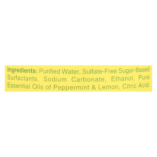 ingredients : purified water;sulfate-free sugar-based surfactants;sodium carbonate;ethanol;pure essential oils of peppermint & lemon;citric acid