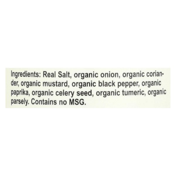 ingredients : ancient sea salt (real salt®);organic garlic;organic onion;organic coriander;organic mustard;organic celery seed;organic black pepper;organic paprika;organic turmeric;organic parsley