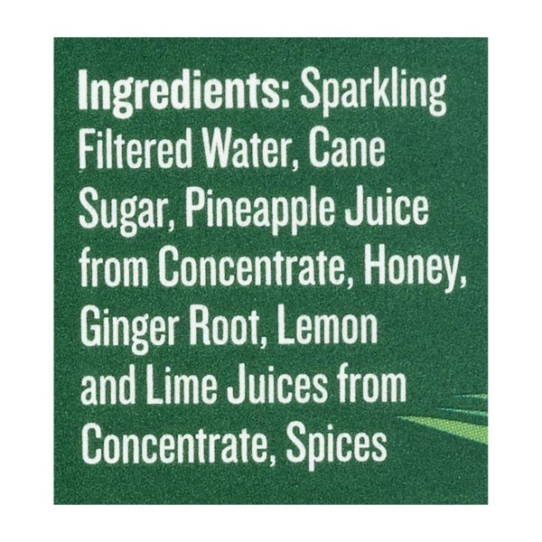 ingredients : sparkling filtered water;cane sugar;pineapple juice from concentrate;honey;ginger root;lemon and lime juices from concentrate;spices