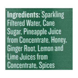 ingredients : sparkling filtered water;cane sugar;pineapple juice from concentrate;honey;ginger root;lemon and lime juices from concentrate;spices