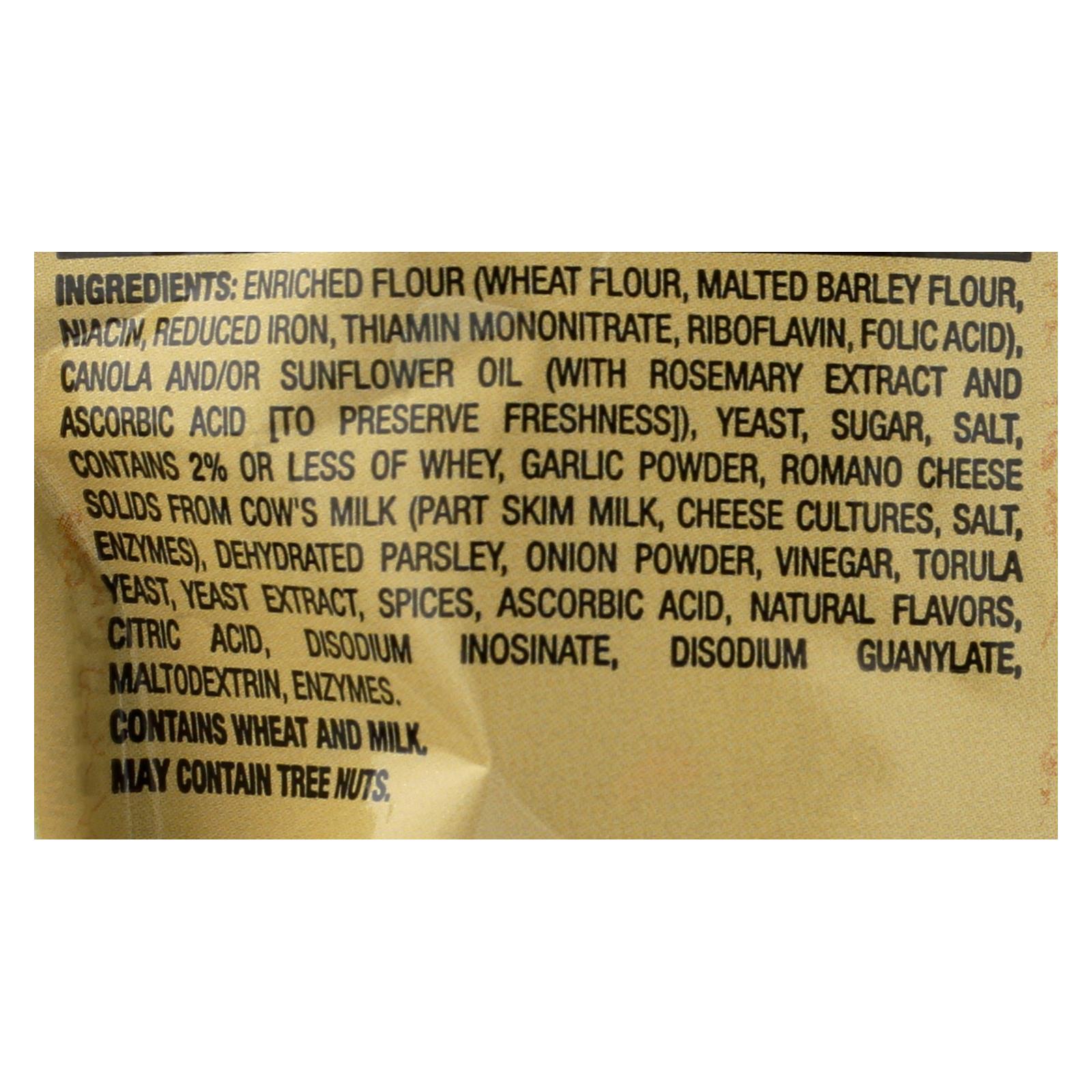 ingredients : enriched flour;wheat flour;malted barley flour;niacin;reduced iron;thiamin mononitrate;riboflavin;folic acid;canola and/or sunflower oil;with rosemary extract and ascorbic acid [to preserve freshness];yeast;sugar;salt;contains 2% or less of whey;garlic powder;romano cheese solids from cow’s milk;part skim milk;cheese cultures;enzymes;dehydrated parsley;onion powder;vinegar;torula yeast;yeast extract;spices;ascorbic acid;natural flavors;citric acid;disodium inosinate;disodium guanylate;maltodextr