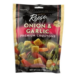 Reese’s croutons in onion & garlic flavor are a seasoned topping that gives salads, soups and casseroles a savory taste. Our 6 oz. Packet of small-cut premium croutons are made from specially formulated dough that allows them to retain the crispness and flavor that crouton lovers seek. See nutrition facts panel for allergens.