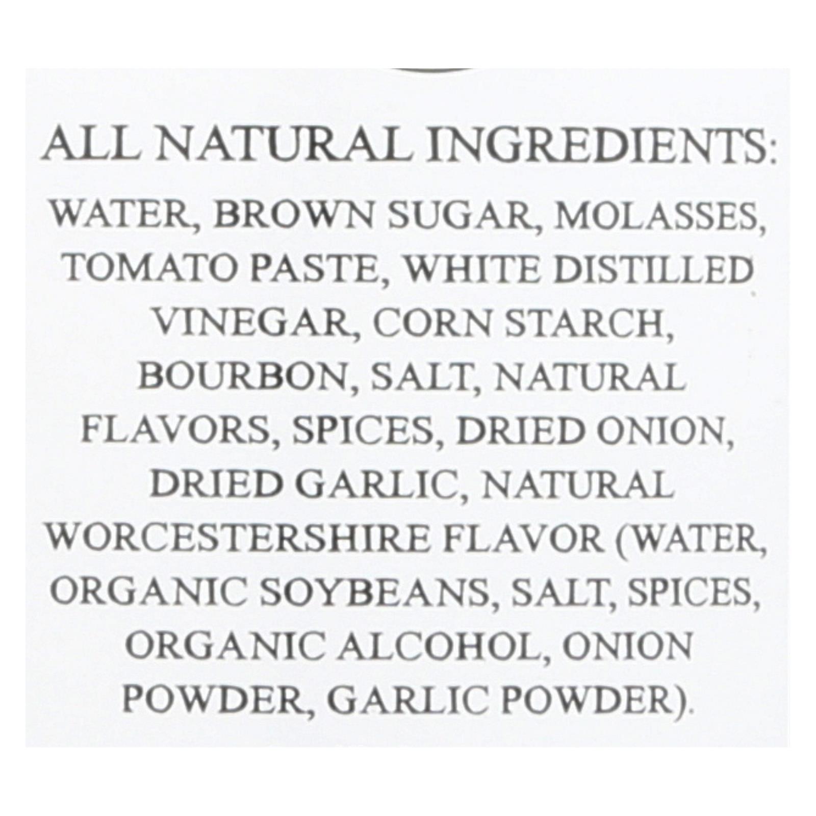 ingredients : brown sugar;tomato puree;water;tomato paste;distilled vinegar;molasses;corn starch;bourbon;salt;natural flavors;including smoke;spices;dried onion;garlic powder;natural worcestershire flavor;organic soybeans;organic alcohol;onion powder