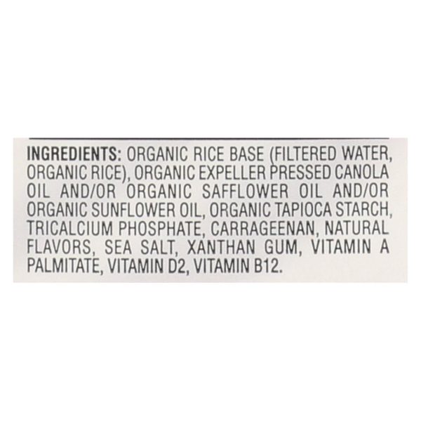 ingredients : organic rice base (filtered water, organic rice);organic expeller pressed canola oil and/or organic safflower oil and/or organic sunflower oil;organic tapioca starch;tricalcium phosphate;carrageenan;natural flavors;sea salt;xanthan gum;vitamin a palmitate;vitamin d2;vitamin b12