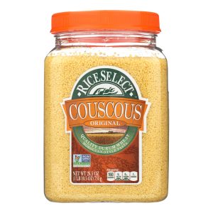 Rice select couscous, original is a moroccan-style pasta made from quality, unenriched durum semolina (wheat). Each 26.5 oz. Jar is non-gmo verified by the non-gmo project. Every 1/4 cup dry serving provides 6 g. Of protein and 1 g. Of dietary fiber with 1 g. Of fat, zero sodium, 1 g. Of sugars and no cholesterol.