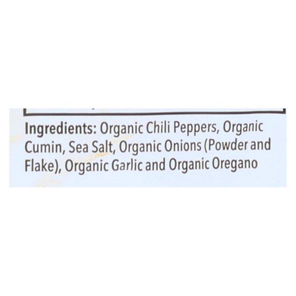 ingredients : organic chili peppers;organic cumin;sea salt;organic onions;powder and flake;organic garlic and organic oregano