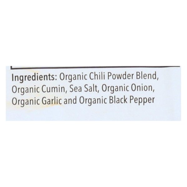 ingredients : organic chili powder blend;organic cumin;sea salt;organic onion;organic garlic and organic black pepper