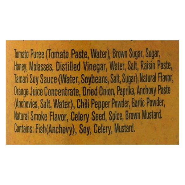 ingredients : tomato puree (tomato paste, water);brown sugar;honey;molasses;distilled vinegar;water;salt;raisin paste;tamari soy sauce (water, soybeans, salt, sugar);natural flavor;orange juice (from concentrate);dried onion;smoke flavor;garlic powder;spices (including mustard flour);celery seed