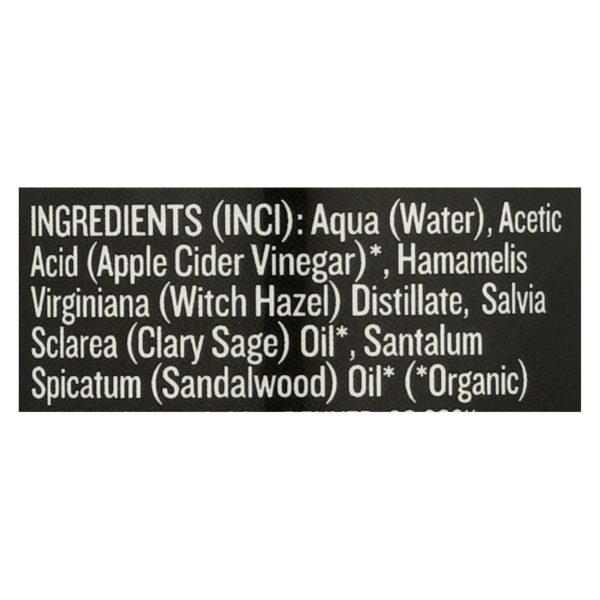 ingredients : inci;: aqua;water;acetic acid;apple cider vinegar;hamamelis virginiana;witch hazel;distillate;salvia sclarea;clary sage;oil;santalum spicatum;sandalwood