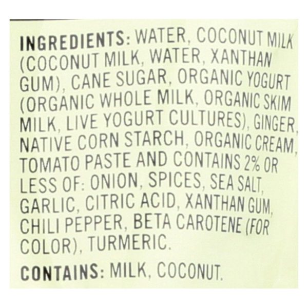 ingredients : water;coconut milk;coconut cream;cane sugar;organic yogurt;organic whole milk;organic skim milk;live yogurt cultures;ginger;native corn starch;organic cream;tomato paste and contains 2% or less of: onion;spices;sea salt;garlic;citric acid;xanthan gum;red chili pepper;turmeric;beta carotene;for color
