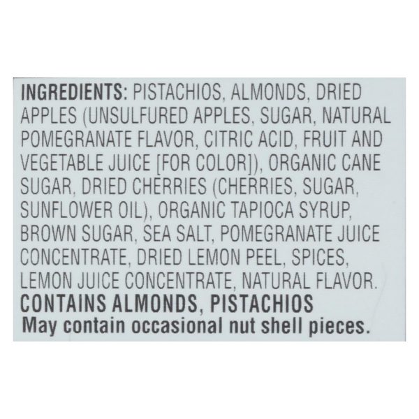 ingredients : pistachios;almonds;dried apples;unsulfured apples;sugar;natural pomegranate flavor;citric acid;fruit and vegetable juice [for color];organic cane sugar;dried cherries;cherries;sunflower oil;organic tapioca syrup;brown sugar sea salt;pomegranate juice concentrate;dried lemon peel;spices;lemon juice concentrate;natural flavor