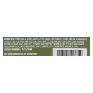 ingredients : pistachios;almonds;dried apples;unsulfured apples;sugar;natural pomegranate flavor;citric acid;fruit and vegetable juice [for color];organic cane sugar;dried cherries;cherries;sunflower oil;organic tapioca syrup;brown sugar;sea salt;pomegranate juice concentrate;dried lemon peel;spices;lemon juice concentrate;natural flavor
