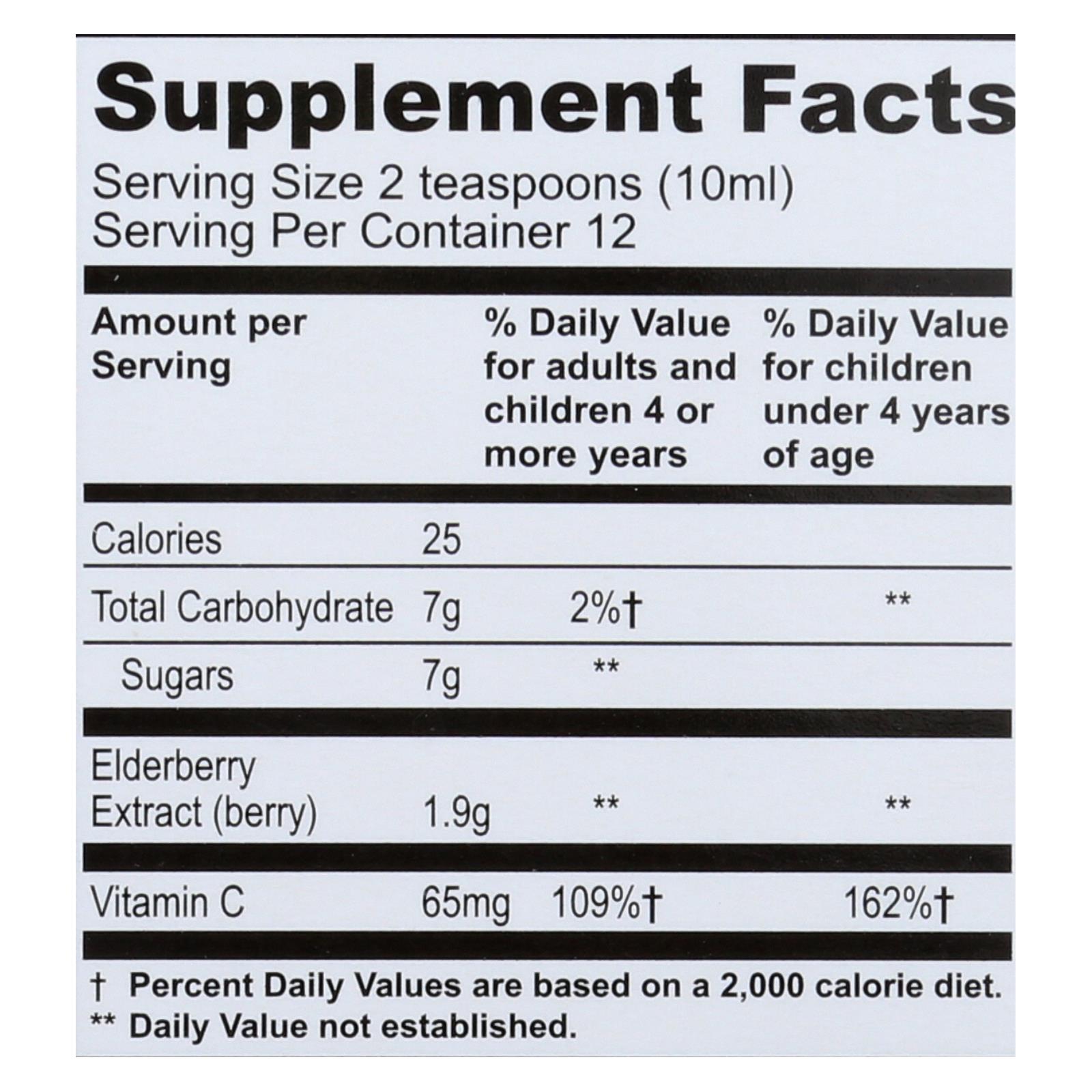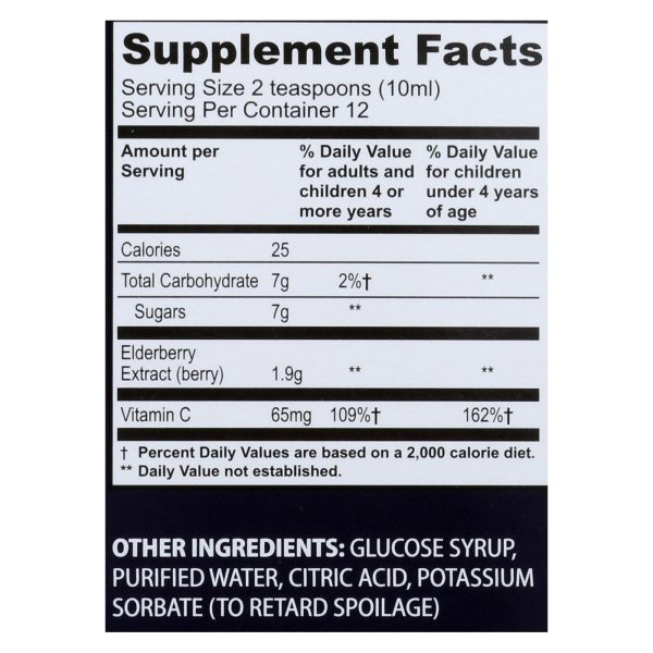 Sambucol black elderberry syrup is an herbal dietary supplement that contains 1.9 g. Of elderberry extract and 65 milligrams of vitamin c per serving. Every 4 fl. Oz. Bottle of sambucol black elderberry provides twelve 2-teaspoon servings and is made using purified water. See supplement facts panel for usage and additional information.