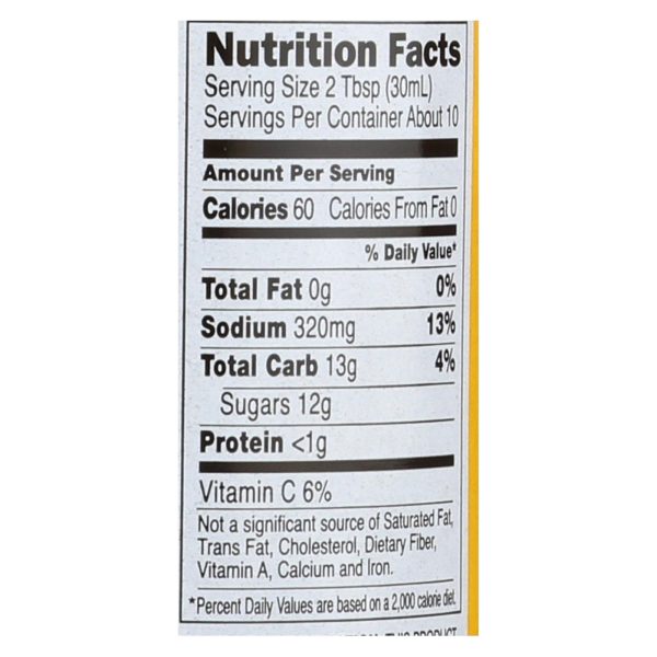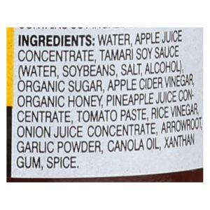 ingredients : water;apple juice concentrate;tamari soy sauce (water, soybeans, salt, alcohol);organic sugar;apple cider vinegar;organic honey;pineapple juice concentrate;tomato paste;rice vinegar;onion juice concentrate;arrowroot;garlic powder;canola oil;xanthan gum;spice