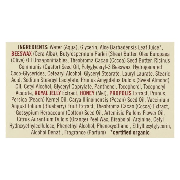 ingredients : water (aqua);glycerin;aloe barbadensis leaf juice;beeswax (cera alba);butyrospermum parkii (shea) butter;olea europaea (olive) oil unsaponifiables;theobroma cacao (cocoa) seed butter;ricinus communis (castor) seed oil;polyglyceryl-3 beeswax;hydrogenated coco-glycerides;cetearyl alcohol;glyceryl stearate;lauryl laurate;stearic acid;sodium stearoyl lactylate;prunus amygdalus dulcis (sweet almond) oil;cetyl alcohol;glyceryl caprylate;panthenol;tocopherol;tocopheryl acetate;royal jelly extract;honey