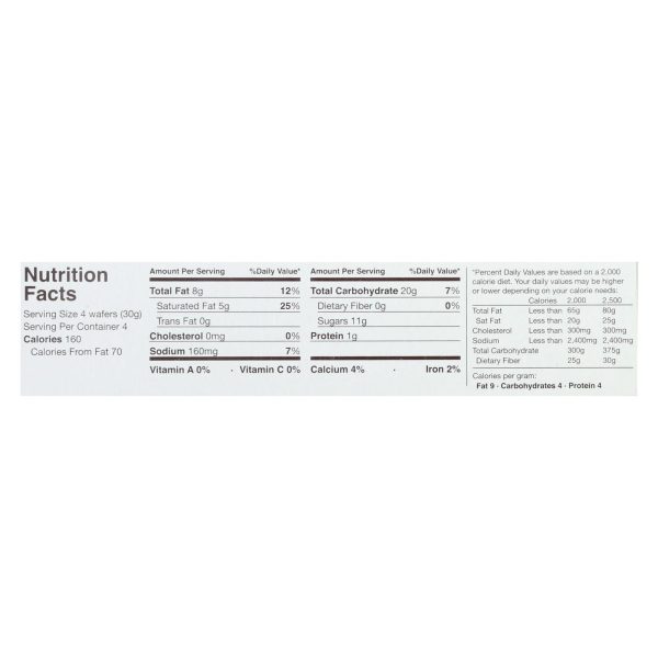 Sch r vanilla wafers are crispy wafer cookies with vanilla filling. This 4.4 oz. Box of cookies is a non-gmo product and does not contain artificial preservatives. These cookies are also gluten-free and free of wheat, but contain milk and soy and may contain tree nuts. See the nutrition facts panel for allergens.