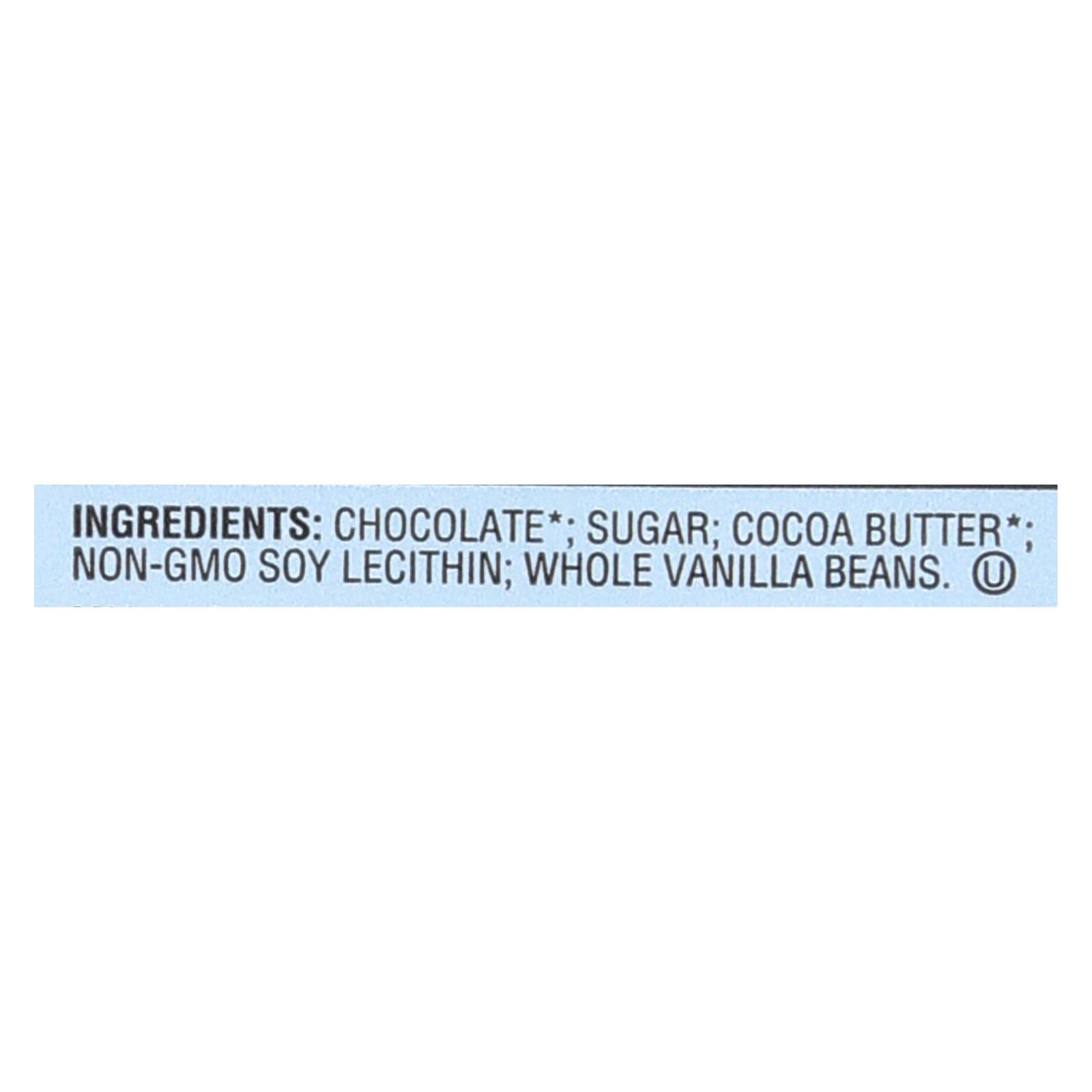 ingredients : cacao beans;sugar;cocoa butter;sunflower lecithin;vanilla bean
