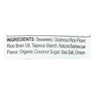 ingredients : seaweed;glutinous rice flour;rice bran oil;tapioca starch;natural barbecue flavor;organic coconut sugar;sea salt;onion