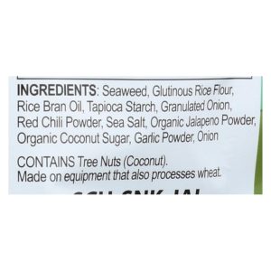 ingredients : seaweed;glutinous rice flour;rice bran oil;tapioca starch;granulated onion;red chili powder;sea salt;organic jalapeno powder;organic coconut sugar;garlic powder;onion