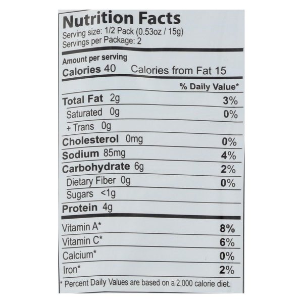 Seasnax chomperz original seaweed chips are a verified non-gmo food product. These seaweed chips come in one 1 oz. Bag and contain no cholesterol, msg or trans fat. Each serving has just 2 g. Of fat, 40 calories, 85 mg. Of sodium and less than 1 g. Of sugars. See nutrition facts panel for allergens.