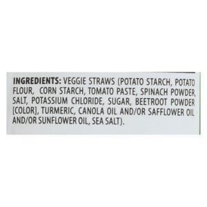 ingredients : veggie straws;potato starch;potato flour;corn starch;tomato paste;spinach powder;salt;potassium chloride;sugar;beetroot powder [color];turmeric;canola oil and/or safflower oil and/or sunflower oil;sea salt