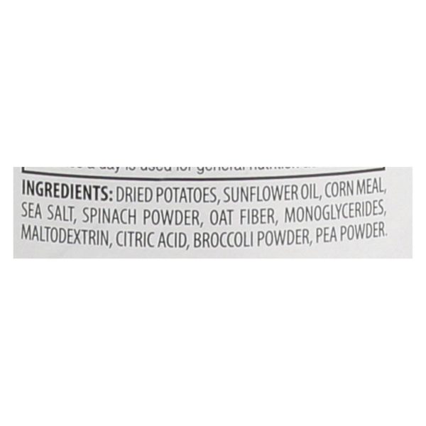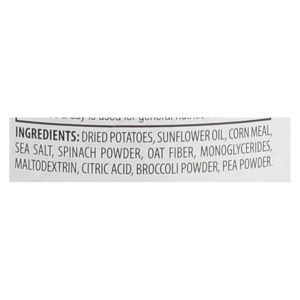 ingredients : dried potatoes;sunflower oil;corn meal;sea salt;spinach powder;oat fiber;monoglycerides;maltodextrin;citric acid;broccoli powder;pea powder