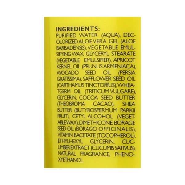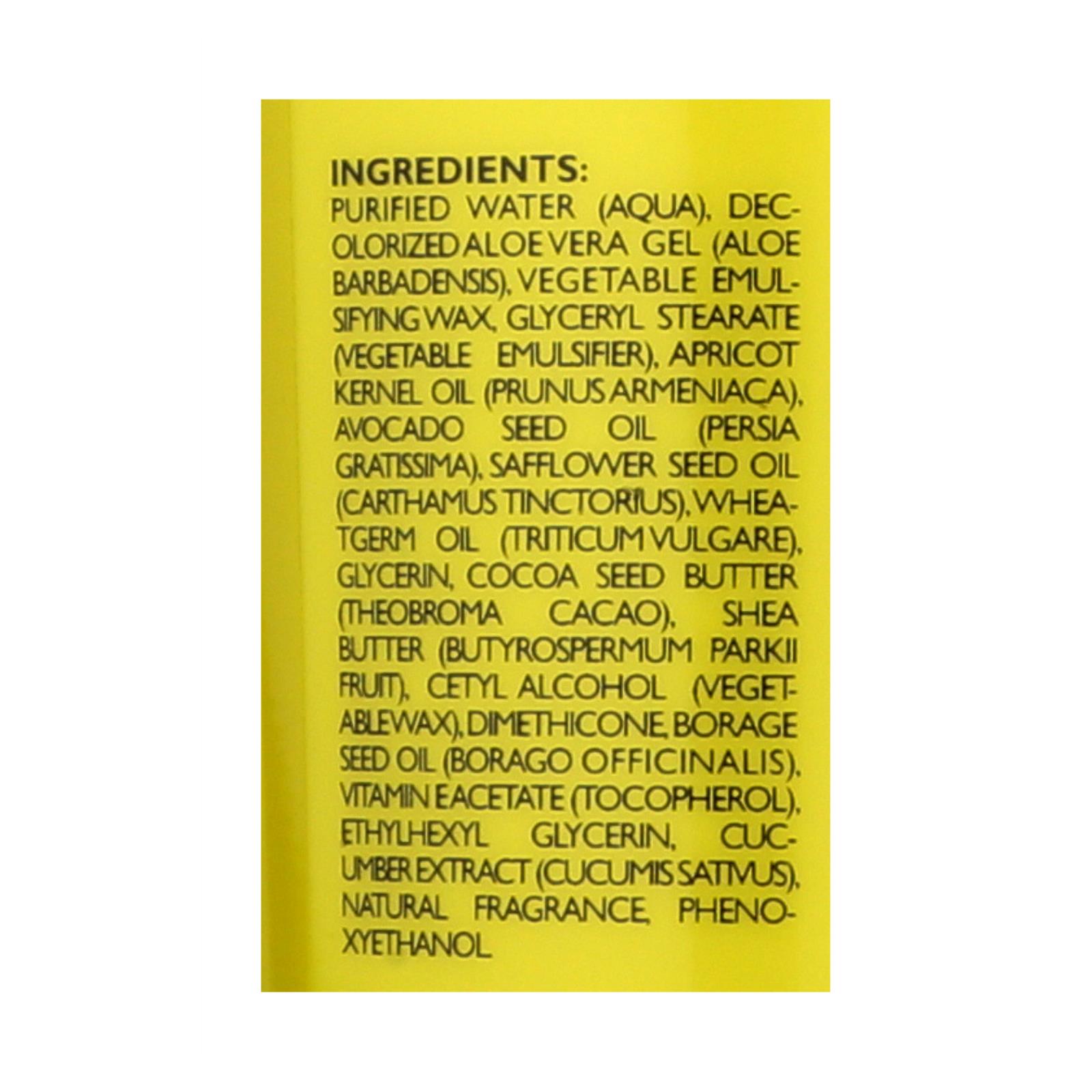 ingredients : purified water;aqua;decolorized aloe vera gel;aloe barbadensis;vegetable emulsifying wax;glyceryl stearate;vegetable emulsifier;apricot kernel oil;prunus armeniaca;avocado seed oil;persia gratissima;safflower seed oil;carthamus tinctorius;wheatgerm oil;triticum vulgare;glycerin;cocoa seed butter;theobroma cacao;shea butter;butyrospermum parkii fruit;cetyl alcohol;vegetable wax;dimethicone;borage seed oil;borago officinalis;vitamin e acetate;tocopherol;ethylhexyl glycerin;cucumber extract;cucumis