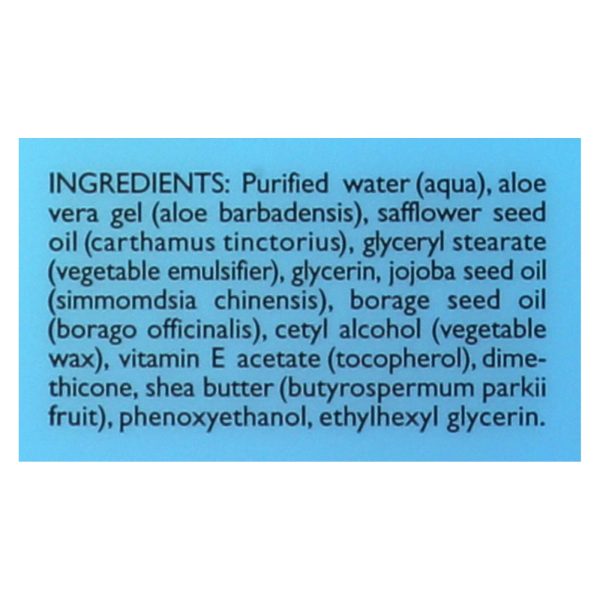 ingredients : purified water;aqua;aloe vera gel;aloe barbadensis;safflower seed oil;carthamus tinctorius;glyceryl stearate;vegetable emulsifier;glycerin;jojoba seed oil;simmomdsia chinensis;borage seed oil;borago officinalis;cetyl alcohol;vegetable wax;vitamin e acetate;tocopherol;dimethicone;shea butter;butyrospermum parkii fruit;phenoxyethanol;ethylhexyl glycerin