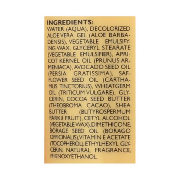 ingredients : water;aqua;decolorized aloe vera gel;aloe barbadensis;vegetable emulsifying wax;glyceryl stearate;vegetable emulsifier;apricot kernel oil;prunus armeniaca;avocado seed oil;persia gratissima;safflower seed oil;carthamus tinctorius;wheatgerm oil;triticum vulgare;glycerin;cocoa seed butter;theobroma cacao;shea butter;butyrospermum parkii fruit;cetyl alcohol;vegetable wax;dimethicone;borage seed oil;borago officinalis;vitamin e acetate;tocopherol;ethylhexyl glycerin;natural fragrance;phenoxyethanol