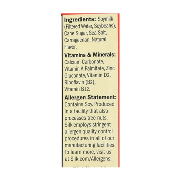 ingredients : calcium carbonate;vitamin a palmitate;zinc gluconate;vitamin d2;riboflavin;b2;vitamin b12;soymilk;filtered water;soybeans;cane sugar;sea salt;carrageenan;natural flavor