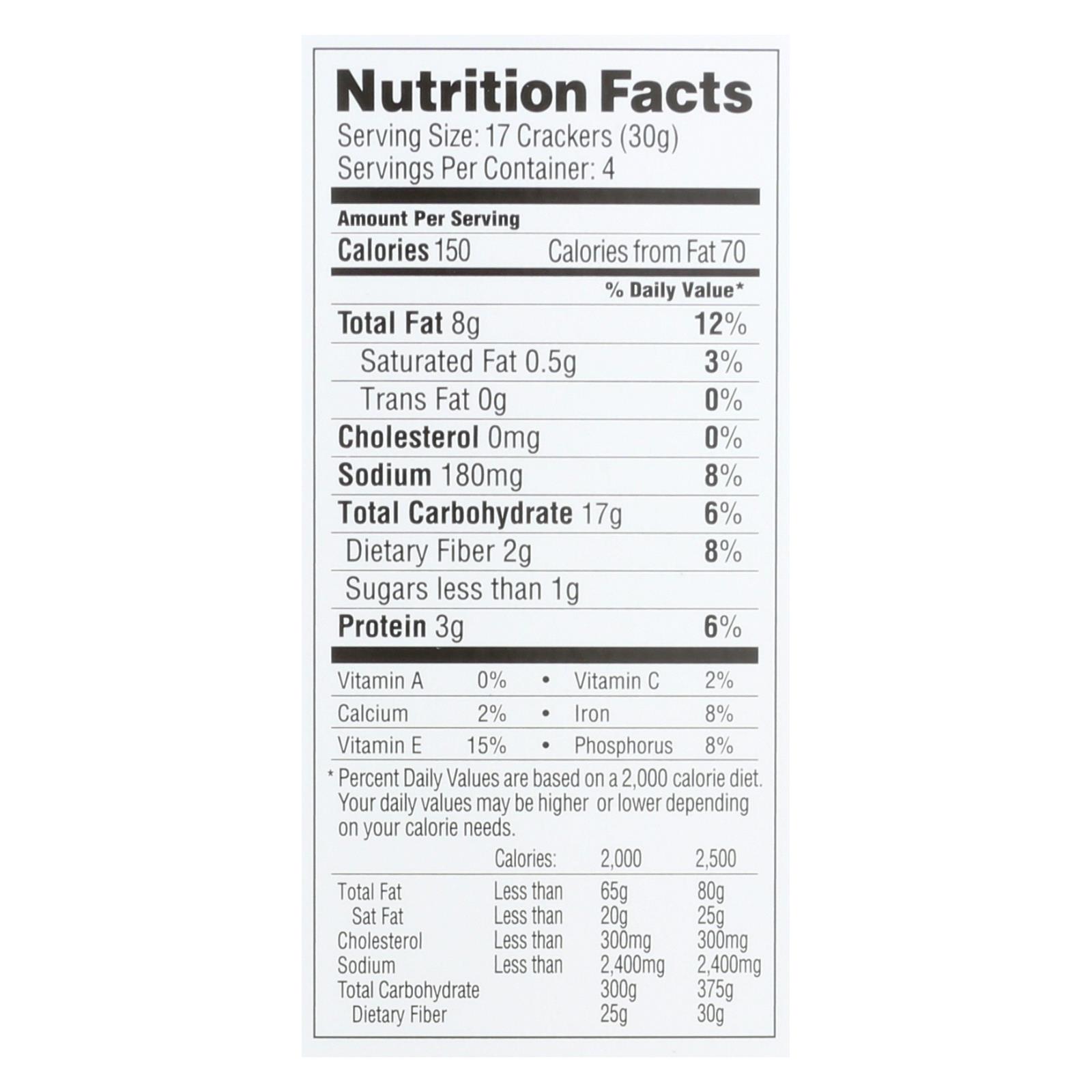 Simple mills ground sea salt crackers are made with nut and seed flour blend, tapioca, cassava, organic sunflower oil, organic onion, organic garlic, sea salt and rosemary extract. Each 4.25 oz. Box contains 4 servings of about 17 crackers each. Each serving has 150 calories, 3 g. Of protein and 2 g. Of dietary fiber.