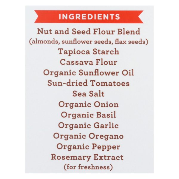 ingredients : nut & seed flour blend;almonds;sunflower seeds;flax seeds;tapioca starch cassava flour organic sunflower oil sun-dried tomatoes sea salt organic onion organic basil organic garlic organic oregano organic pepper rosemary extract;for freshness