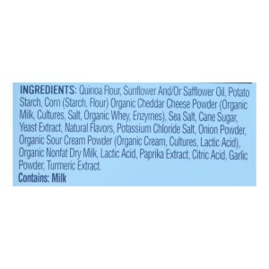 ingredients : quinoa flour;sunflower and/or safflower oil;potato starch;corn;starch;flour;organic cheddar cheese powder;organic milk;cultures;salt;organic whey;enzymes;sea salt;cane sugar;yeast extract;natural flavors;potassium chloride salt;onion powder;organic sour cream powder;organic cream;lactic acid;organic nonfat dry milk;paprika extract;citric acid;garlic powder;turmeric extract