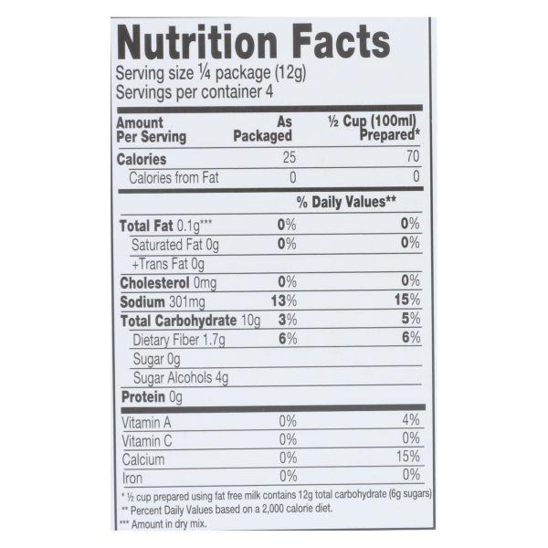 Simply delish strawberry instant pudding & pie filling is a natural, vegan, gluten-free, lactose-free and dairy-free dessert. Each serving in our 1.6 oz. Box is sugar free and fat free, containing 25 calories and 3 g. Sugar alcohols. Our product is made from starch, erythritol, dextrim, emulsifiers, natural strawberry flavor, natural color from beets, steviol extract and salt.