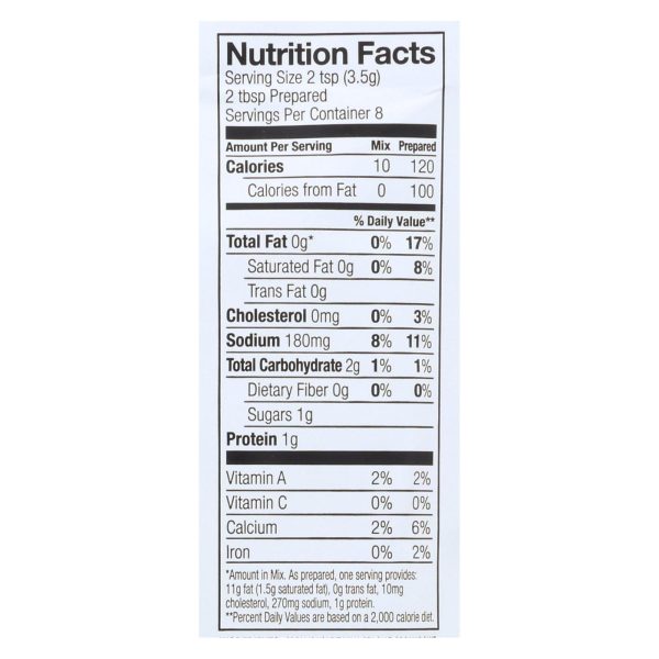 Simply organic ranch dressing mix is a usda-certified organic seasoning packet that is also totally vegetarian and certified gluten free. Each 1 oz. Packet of dressing mix is non-irradiated, non-toxic and not genetically engineered. This mix is also kosher-dairy. See nutrition facts panel for allergens.