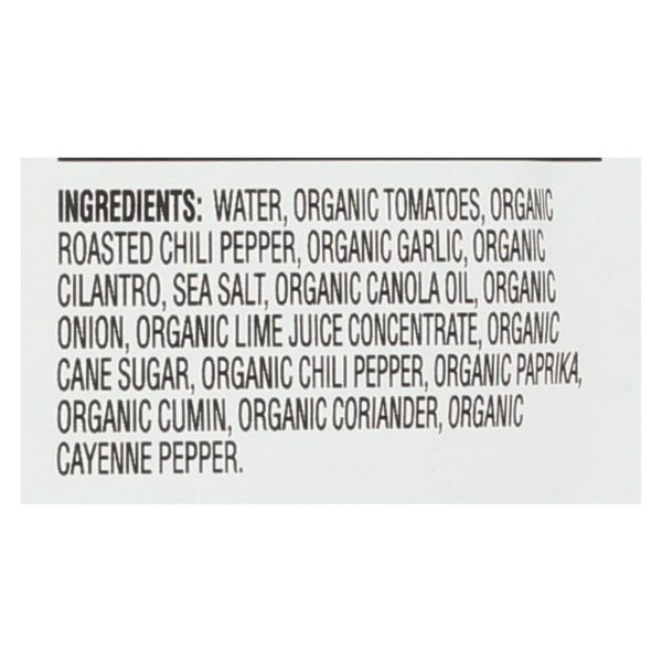 ingredients : water;organic tomatoes;organic roasted chili pepper;organic garlic;organic cilantro;sea salt;organic canola oil;organic onion;organic lime juice concentrate;organic cane sugar;organic chili pepper;organic paprika;organic cumin;organic coriander;organic cayenne pepper