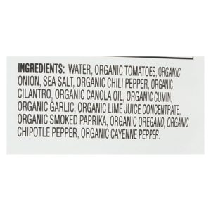 ingredients : water;organic tomatoes;organic onion;sea salt;organic chili pepper;organic cilantro;organic canola oil;organic cumin;organic garlic;organic lime juice concentrate;organic smoked paprika;organic oregano;organic chipotle pepper;organic cayenne pepper
