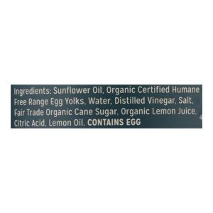 ingredients : sunflower oil;organic certified humane free range egg yolks;water;distilled vinegar;salt;fair trade organic cane sugar;organic lemon juice;citric acid;lemon oil