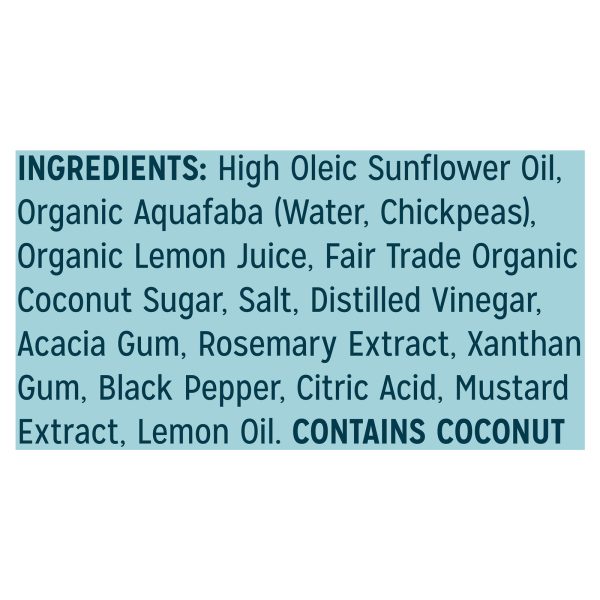 ingredients : high oleic sunflower oil;organic aquafaba (water, chickpeas);organic lemon juice;fair trade organic coconut sugar;salt;distilled vinegar;acacia gum;rosemary extract;xanthan gum;black pepper;citric acid;mustard extract;lemon oil
