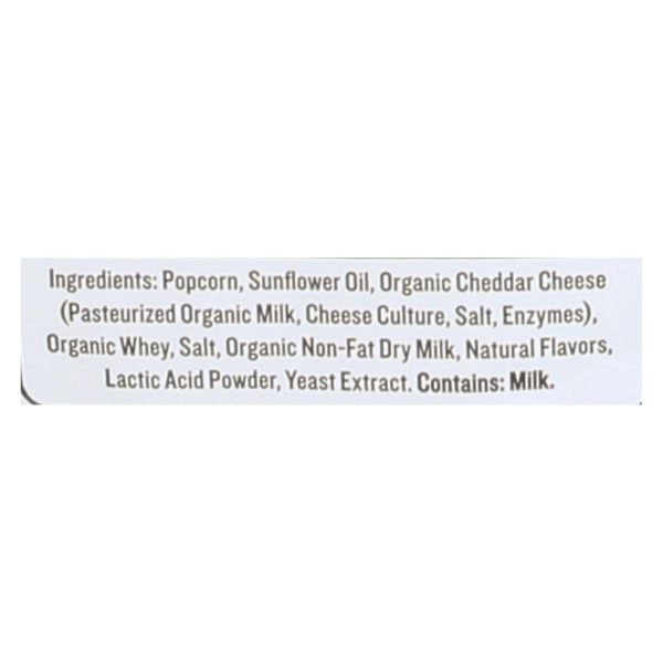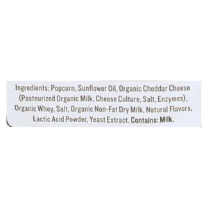 ingredients : popcorn;sunflower oil;organic cheddar cheese;pasteurized organic milk;cheese culture;salt;enzymes;organic whey;organic non-fat dry milk;natural flavors;lactic acid powder;yeast extract