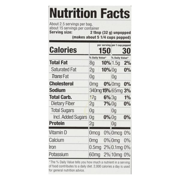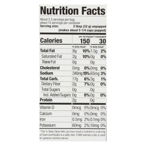 No artificial flavors. 30 calories per cup. Zero trans fat. Certified gluten-free. Certified vegan. Vegan.org. Dairy free (natural non-dairy butter flavor). Peanut free. Tree nut free. 100% whole grain: 23 g or more per serving. Eat 48 g or more of whole grains daily. Wholegrainscouncil.org. Zero trans fat. Non gmo project verified. Nongmoproject.org. Non gmo. 6 microwave bags. About 2.5 servings per bag. New! no artificial ingredients. Chemical free lined bags. Made with responsibly sourced palm oil. Preservative free. No pfoas. No diacetyl and delicious! skinnypop.com. Try our new! microwave popcorn bag today! popped skinny in the usa.