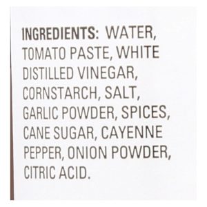 ingredients : water;tomato paste;distilled vinegar;less than 2% of dried garlic;spices;corn starch;salt;cane sugar;lemon juice concentrate;dried onion;chili powder;dried garlic;paprika