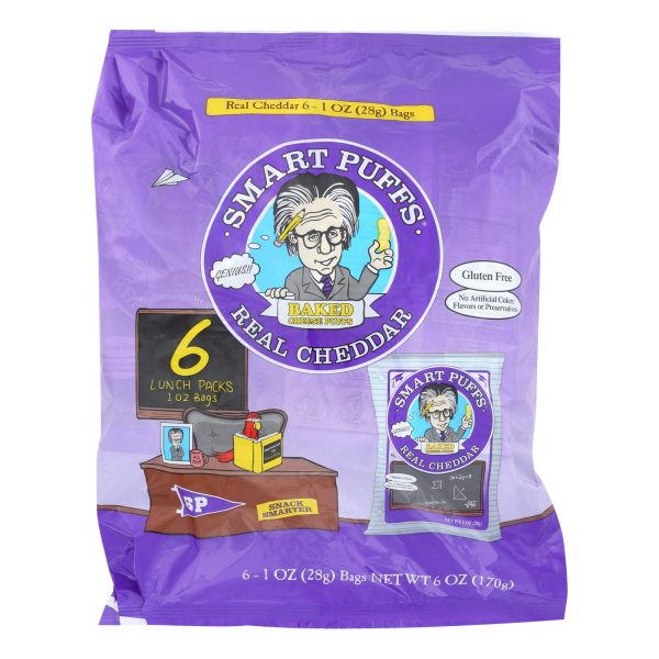 Smart puffs real cheddar baked cheese puffs fulfill your craving for a cheesy, crunchy snack. We combine real cheddar with cornmeal and a handful of other basic ingredients to ensure quality flavor and texture. Our six count pack contains smaller 1 oz. Bags, which make a wholesome snack to enjoy solo or on the side with your favorite sandwich. Smart puffs are also a casual, scrumptious appetizer on game day or movie night.