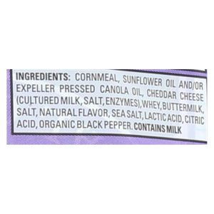 ingredients : cornmeal;sunflower oil and/or expeller pressed canola oil;cheddar cheese;cultured milk;salt;enzymes;whey;buttermilk;natural flavor;sea salt;lactic acid;citric acid;organic black pepper