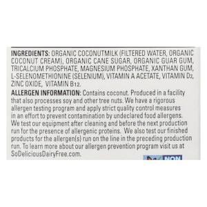 ingredients : organic coconutmilk (filtered water, organic coconut cream);organic cane sugar;organic guar gum;tricalcium phosphate;magnesium phosphate;xanthan gum;l-selenomethionine (selenium);vitamin a acetate;vitamin d₂;zinc oxide;vitamin b₁₂