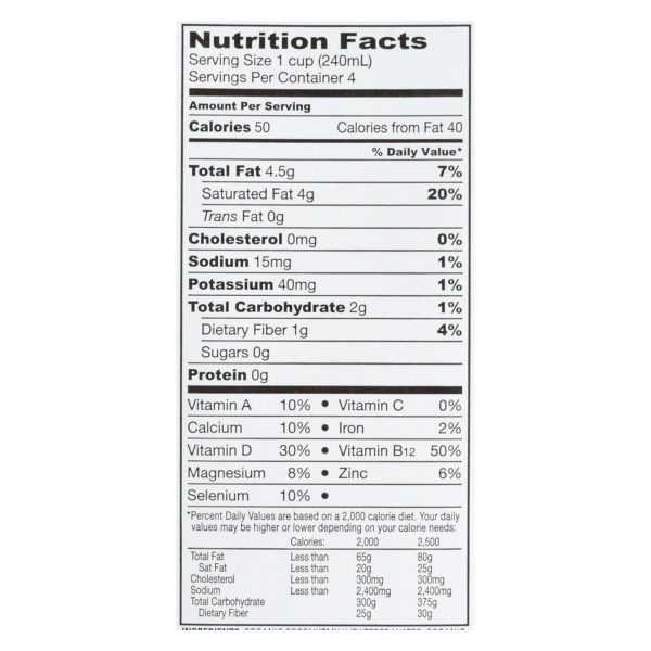 ingredients : organic coconutmilk;filtered water;organic coconut cream;organic guar gum;vitamin and mineral blend;calcium phosphate;magnesium phosphate;calcium carbonate;l-selenomethionine [selenium];vitamin a acetate;vitamin d2;zinc oxide;vitamin b12;natural flavor;xanthan gum