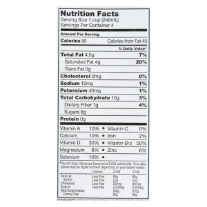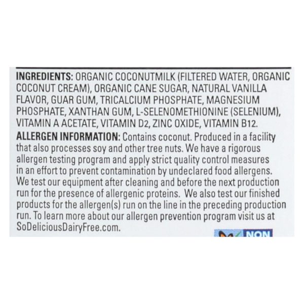 So delicious vanilla coconut milk is a 100% usda-certified organic beverage. This certified gluten-free coconut milk comes in one 1 qt. Carton and contains 0 g. Of trans fat or cholesterol. It is certified kosher-parve and certified vegan, and each serving contains just 80 calories. See nutrition facts panel for allergens.